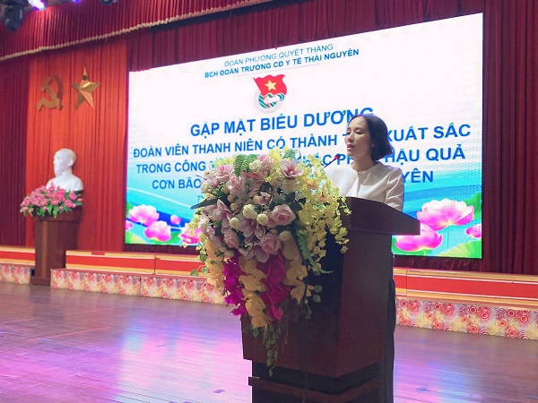 Phát biểu tại buổi lễ, ThS. Bế Thu Hà – Phó Hiệu trưởng nhà trường thay mặt Ban Giám hiệu biểu dương tinh thần xung kích, tình nguyện và trách nhiệm vì cộng đồng của tuổi trẻ Trường Cao đẳng Y tế Thái Nguyên. Cô nhấn mạnh: “Trong gian khó, hình ảnh những đoàn viên thanh niên khoác áo xanh không quản ngại hiểm nguy, sẵn sàng sẻ chia, giúp đỡ nhân dân vùng lũ chính là minh chứng sống động cho bản lĩnh, trái tim và trách nhiệm của người cán bộ y tế tương lai.”